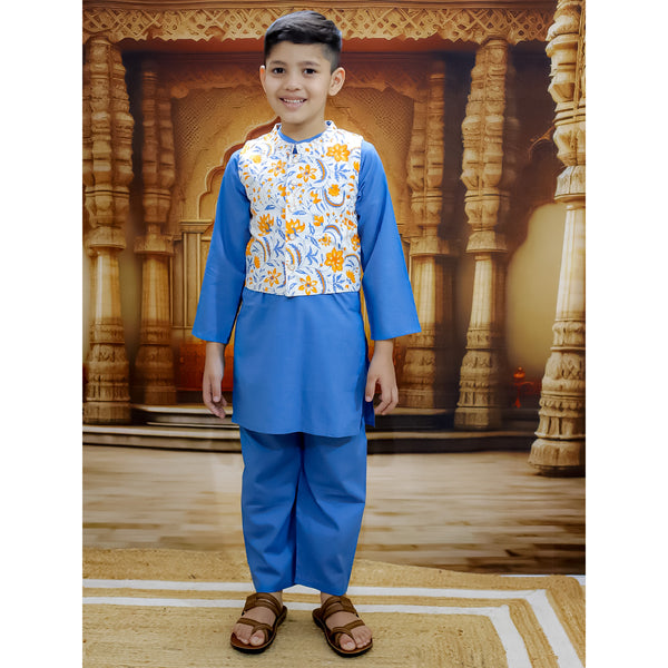 Dress your little prince in the elegant and charming Blue Pure Cotton Printed Kurta Pyjama with Jacket from Junitos. Crafted from soft, breathable pure cotton, this outfit ensures comfort and style for any occasion. The...
