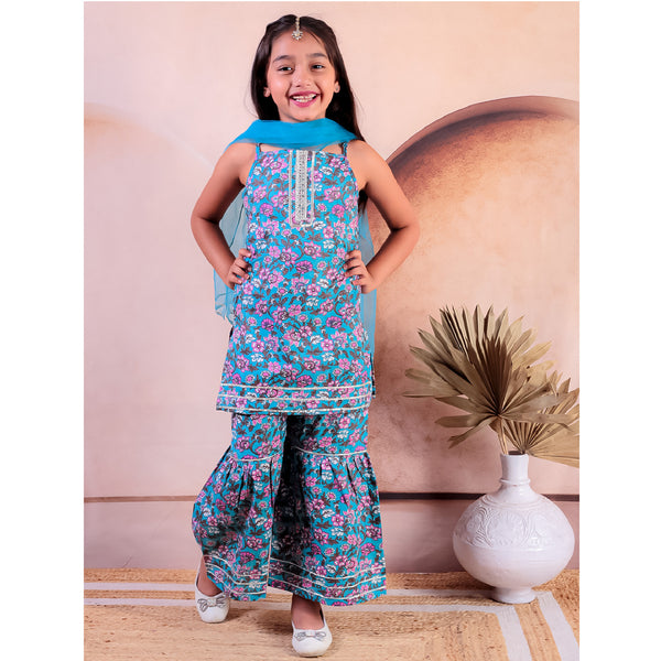 Girls Floral Printed Pure Cotton Kurta with Sharara & Dupatta