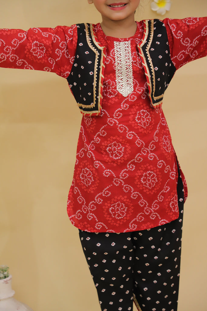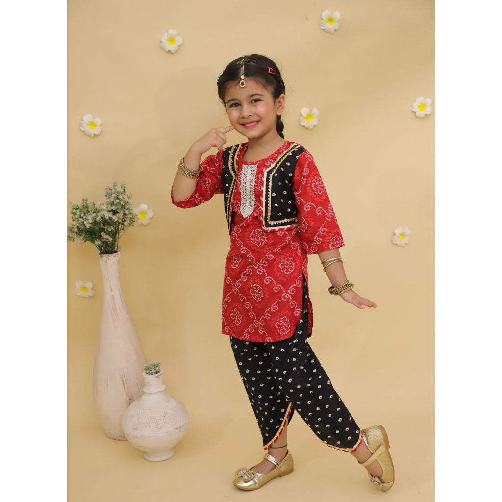 Let your little one shine in traditional elegance with this Girls Bandhani Printed Gotta Patti Kurta with Dhoti Pants. Crafted from pure cotton, this set ensures all-day comfort while keeping the ethnic charm alive. The Bandhani print adds a touch of vibrant tradition, beautifully enhanced with Gotta Patti detailing for that festive sparkle.