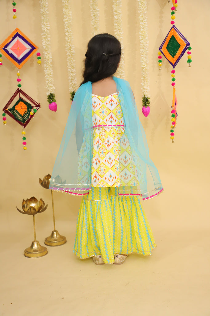 Let your little one steal the spotlight in this charming Girls Printed Angrakha Style Kurti with Sharara and Dupatta set. Made from pure cotton, it offers unmatched comfort while showcasing vibrant ethnic prints and intricate Gotta Patti detailing for a festive touch.